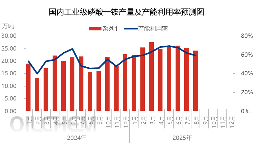 截至2025年8月,工业级磷酸一铵行业集体月度开工59.36%,同比延长13.93%;月度产量24.26万吨,同比昨年延长53.25%;企业为缓解库存压力,采用“保底策略”或按单商说,代价众有松动,但下逛需求并未有实际性改正,代价下行反而加强了“买涨不买跌”的心情。变成“下逛游移-采购削减-库存承压-代价下行-游移加深”的恶性轮回。